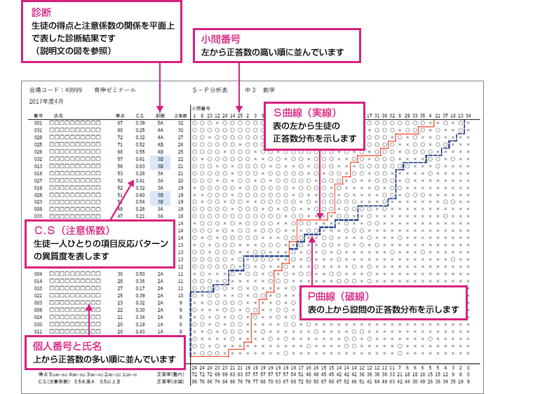 S曲線とP曲線の上側にある×は、生徒の単純なミスによるものかもしれませんが、下側の×は本当に解答できなかったものと推測できます。今後の重点項目の発見に繋げられます。